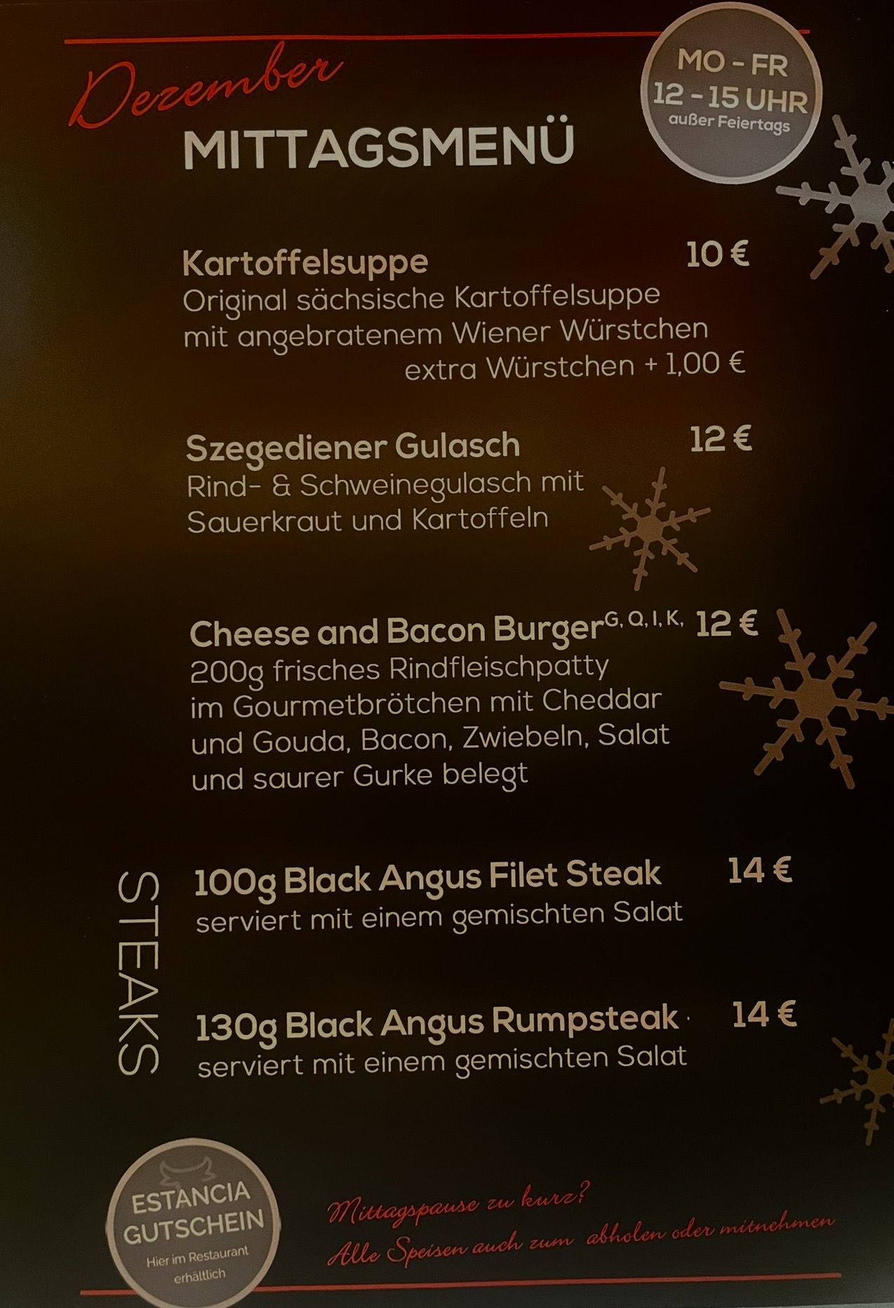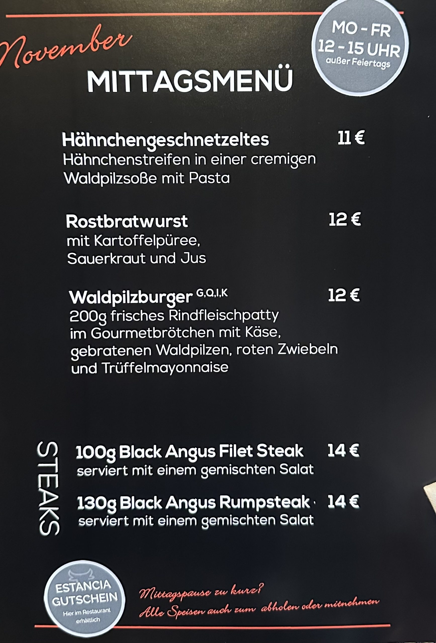 Wir verarbeiten selbstverständlich hochwertige und frische Produkte. Das Rindfleisch beziehen wir ausschließlich als Frischfleisch aus Argentinien oder Irland, grillen die Steaks auf einem echten Holzkohlengrill, was den Geschmack unverwechselbar macht und bieten Ihnen Mittags ein monatlich wechselndes Mittagsmenü.